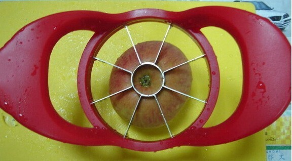 使用方法很簡單,把蘋果放在下面,手握蘋果切片器從上往下一刀切!力道必須要夠足喔~~