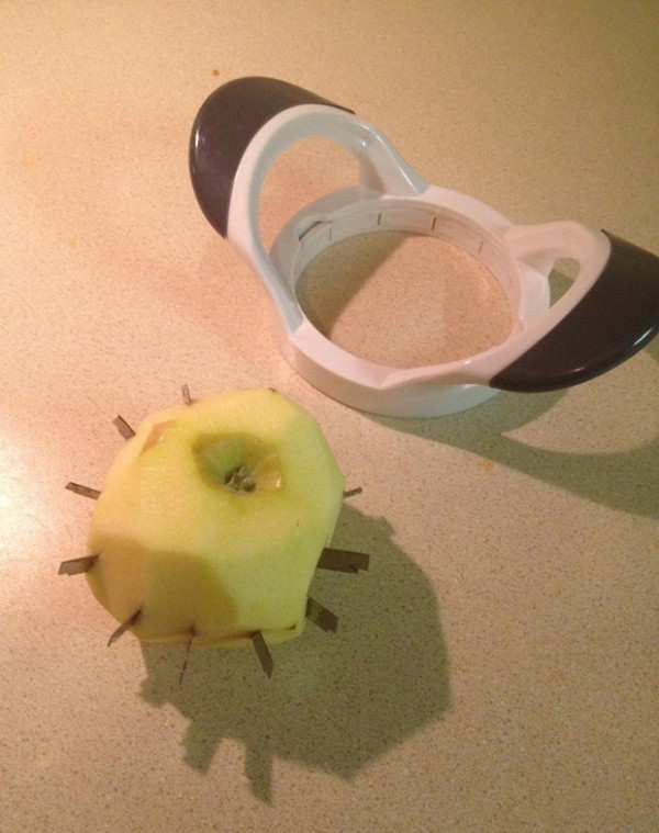 朋友在網上買了一把蘋果切片器,說是切蘋果超容易,一分鐘去核切片!